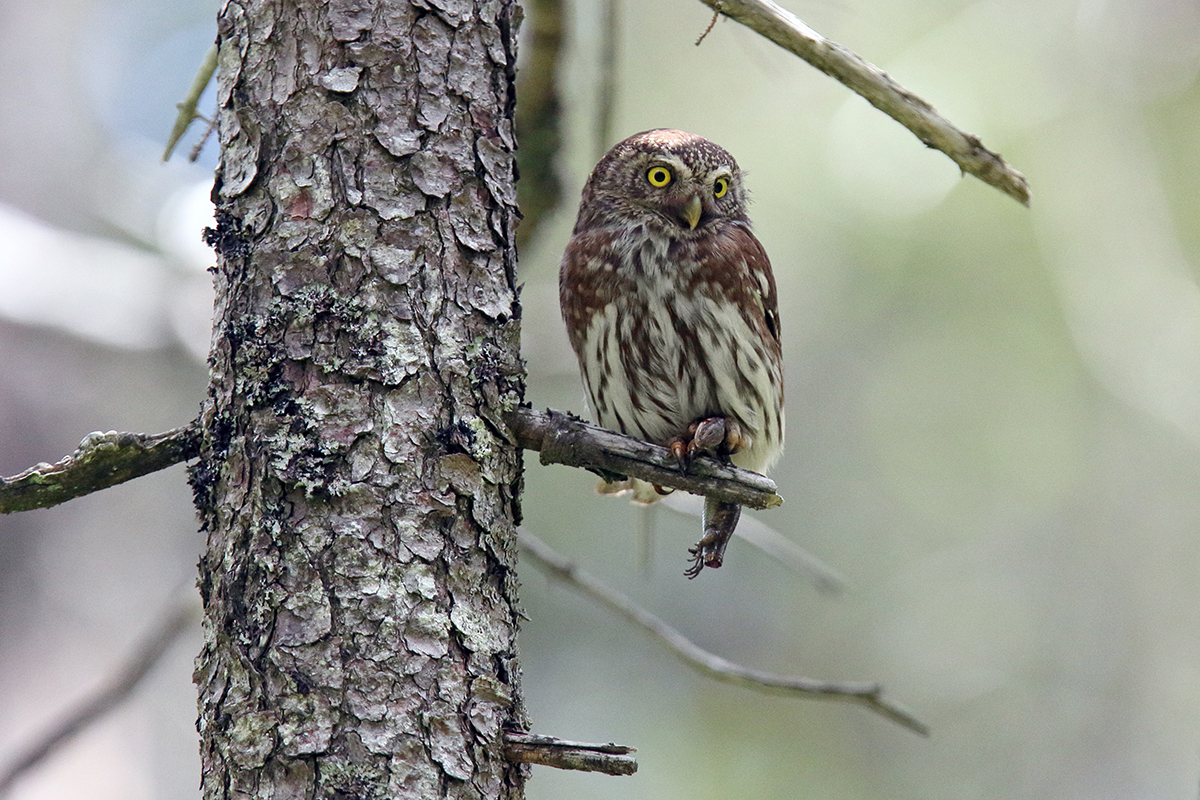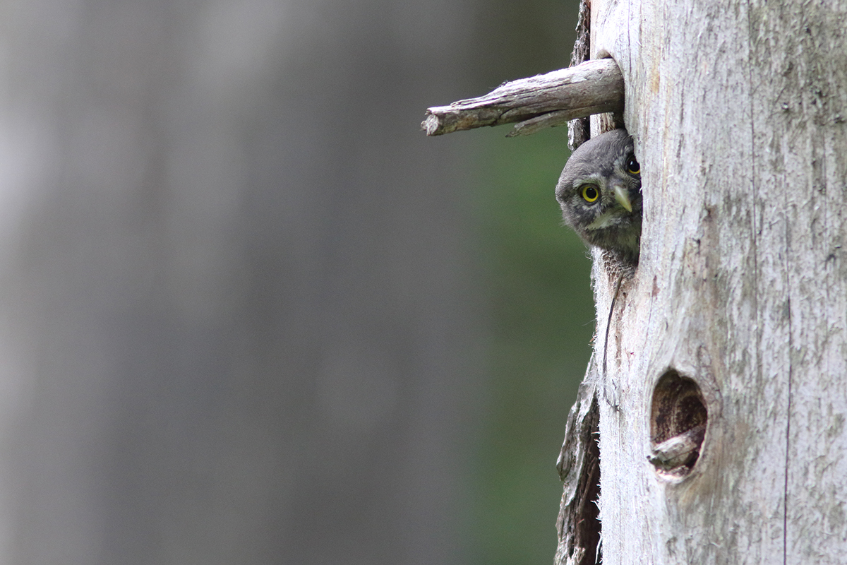 Je suis retourné souvent voir le couple de chouettes chevêchettes qui a élu domicile dans une loge de pic épeiche à seulement 2 mètres de hauteur, dans un petit épicéa tout sec.