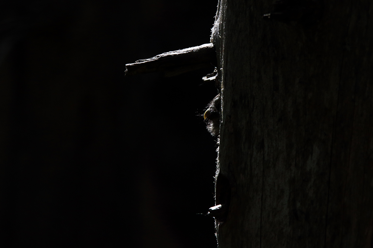 La femelle continue régulièrement à faire le ménage dans la loge, jetant au pied du nid les poils et les plumes des repas précédents. Parfois, les plumes mouillées collent à son bec et lui font secouer la tête avec frénésie pour qu’elles arrêtent de s’agripper !