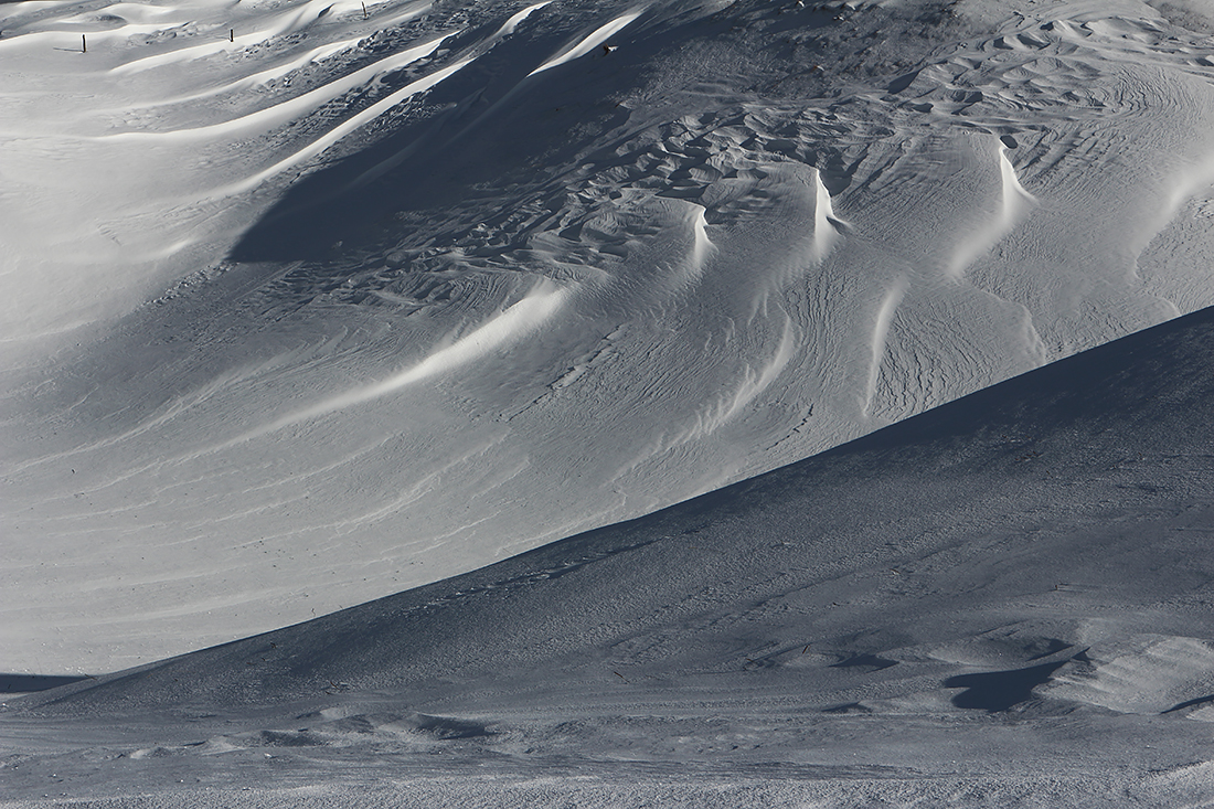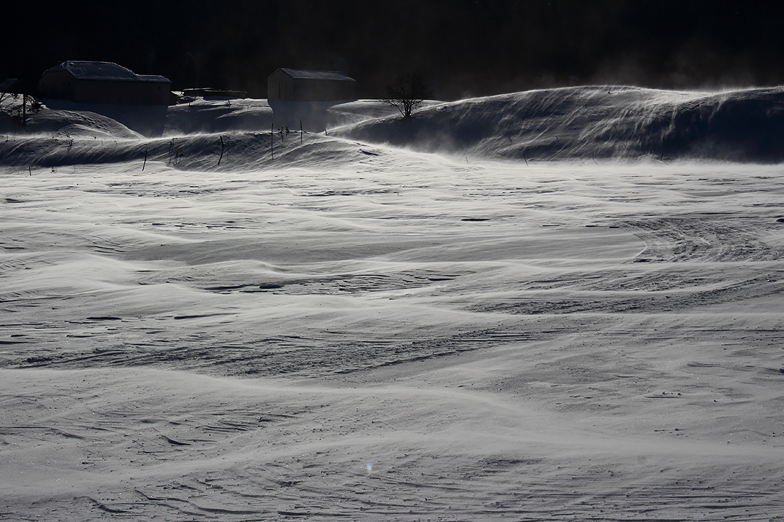 La météo l’avait annoncée, elle avai raison : la bise bat sur les reliefs depuis cette nuit. Il souffle si fort que parfois, j’ai du mal à garder les yeux ouverts. La neige qui vole me fouette le visage comme autant de petites billes qui me colorent la peau en rouge.