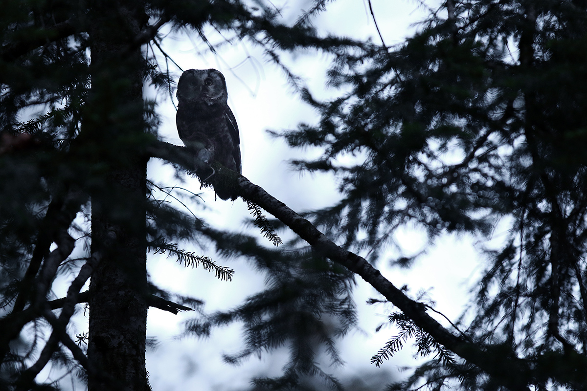 Le lendemain il pleut encore mais beaucoup moins fort. Les températures se sont rafraichies. Décidément, quel temps pour découvrir le monde ! Je vois une chouette loin de la loge, sur un petit épicéa. Comme je suis content de l’avoir vue !