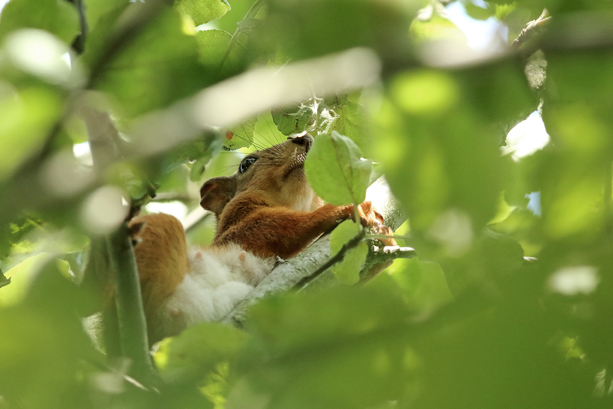 Je termine cet article aux tendances aquatiques avec un écureuil venu faire ses courses dans l’arbre voisin. Les tétines bien en vue, cette femelle a sans doute quelques jeunes qui l’attendent non loin d’ici, à l’abri d’une canopée qui tremble d’excitation !