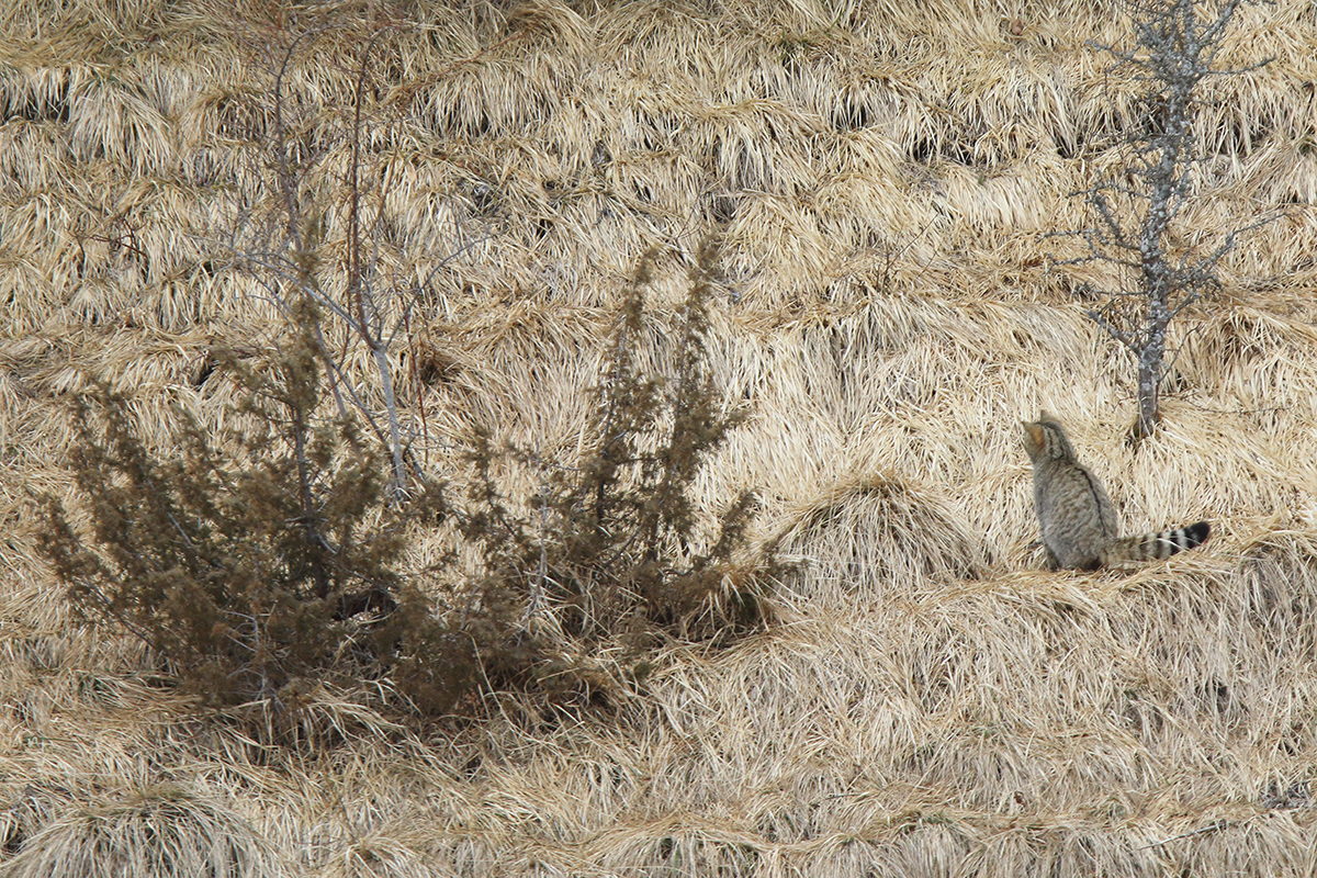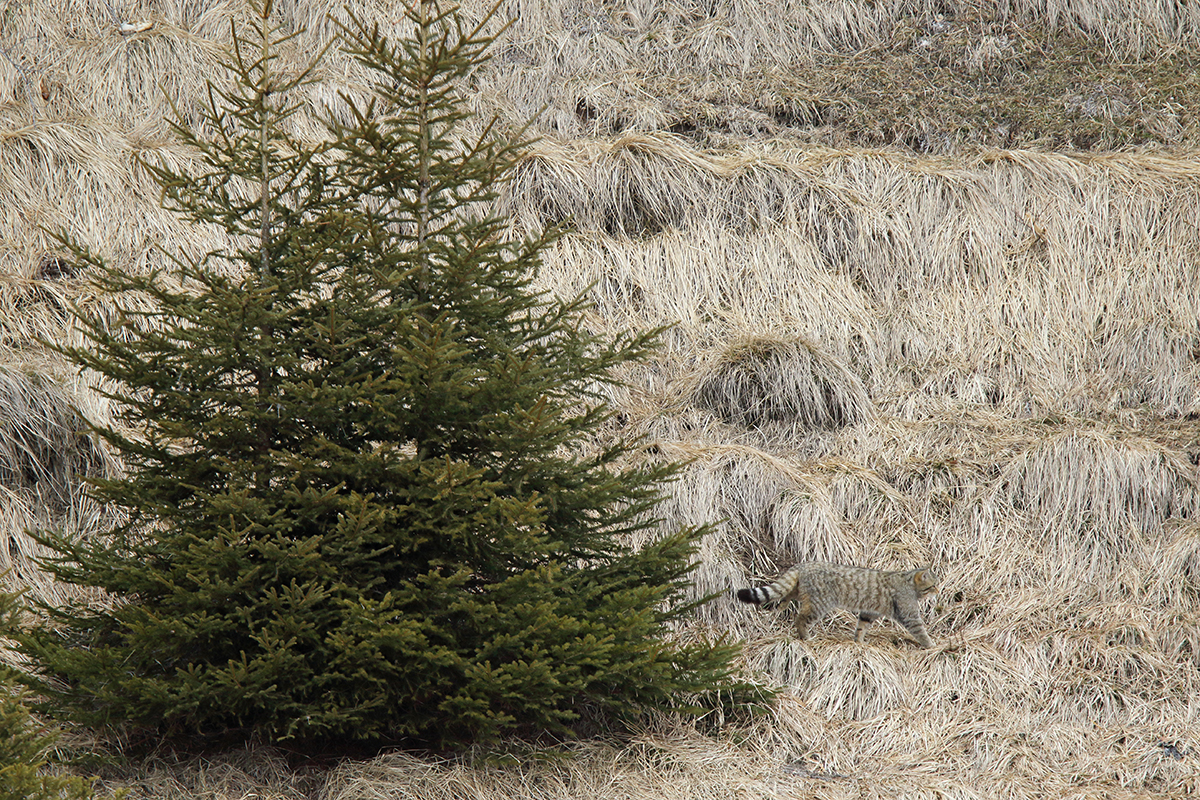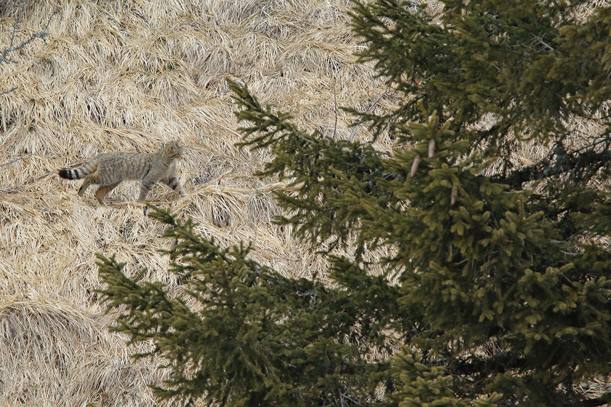 Pour cause, le chat forestier, ou chat sauvage, n’aime pas trop l’hiver et les couches de neige qui l’empêchent de se nourrir. Un individu semble toutefois trouver son bonheur dans les champs décoiffés truffés de taupinières.