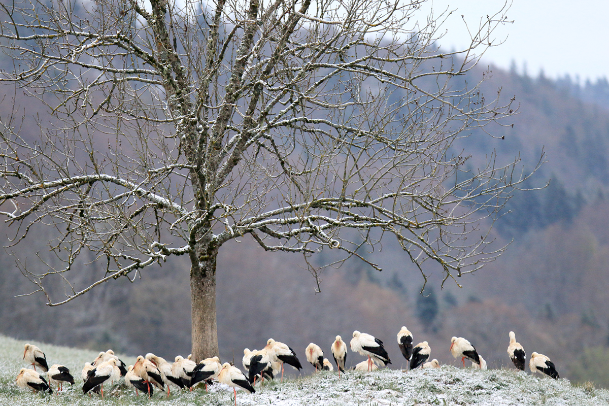 Des cigognes de passage ont fait une halte au pied d’un arbre nu, la tête sous l’oreiller doux et chaud de leur plumage.