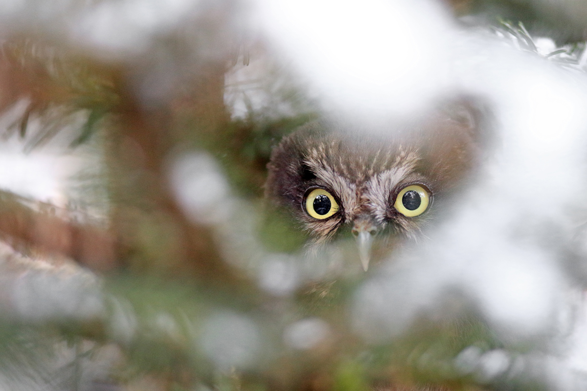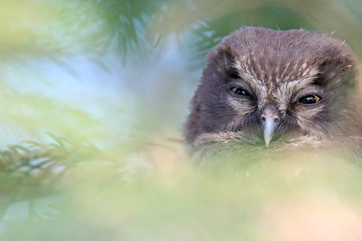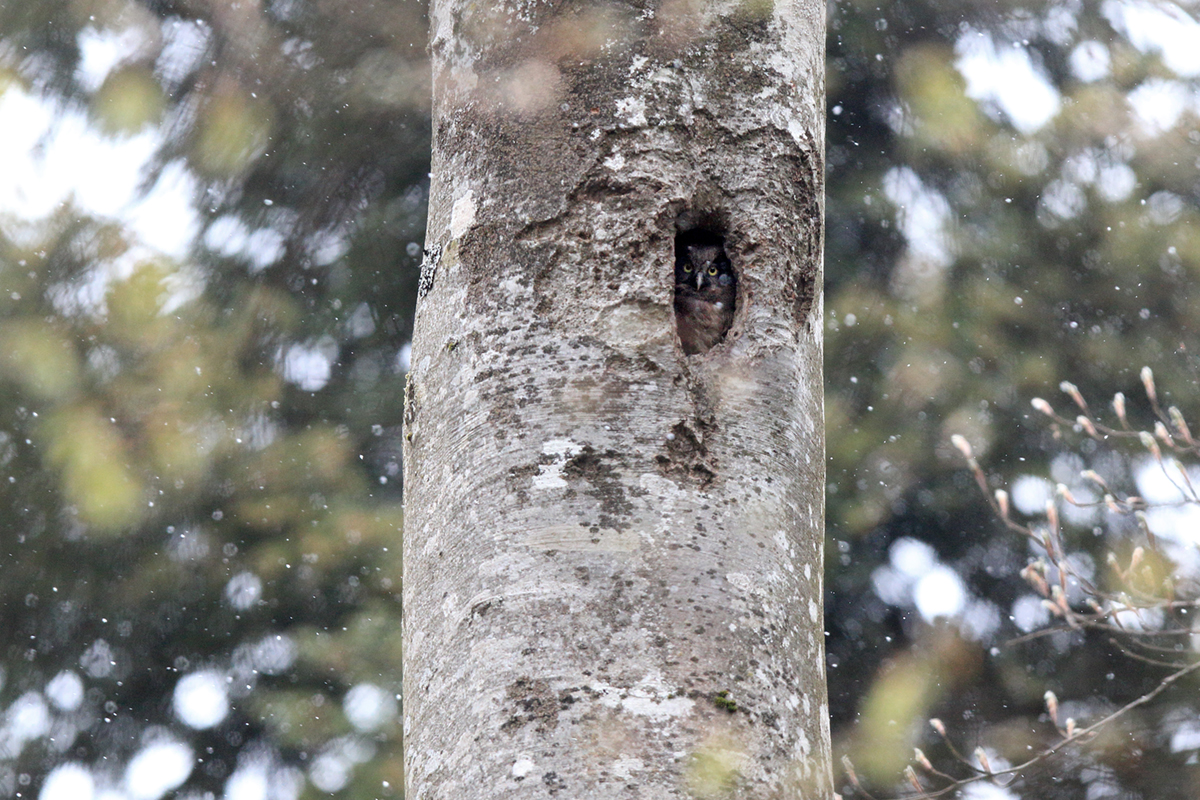 En cette fin avril, les jeunes chouettes de Tengmalm ont bien grandi et regardent déjà par le trou du grand hêtre qui les a vues naître.