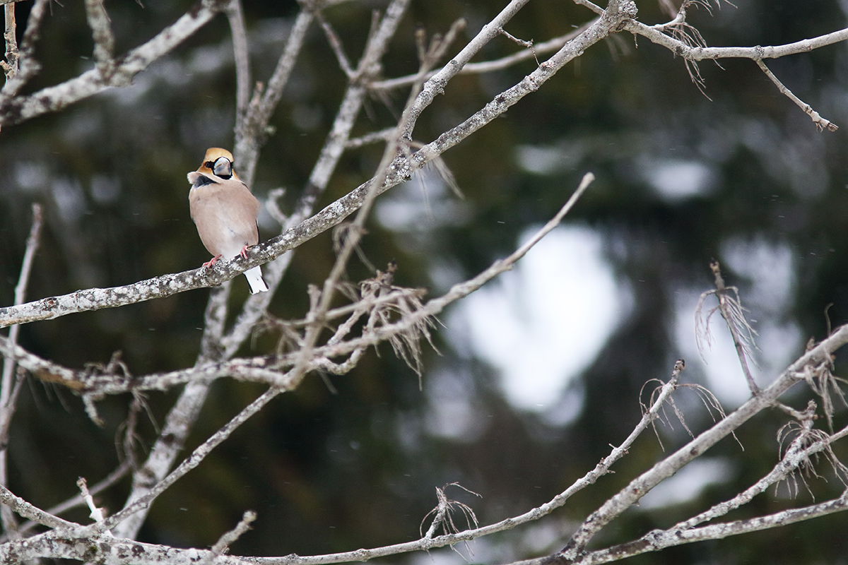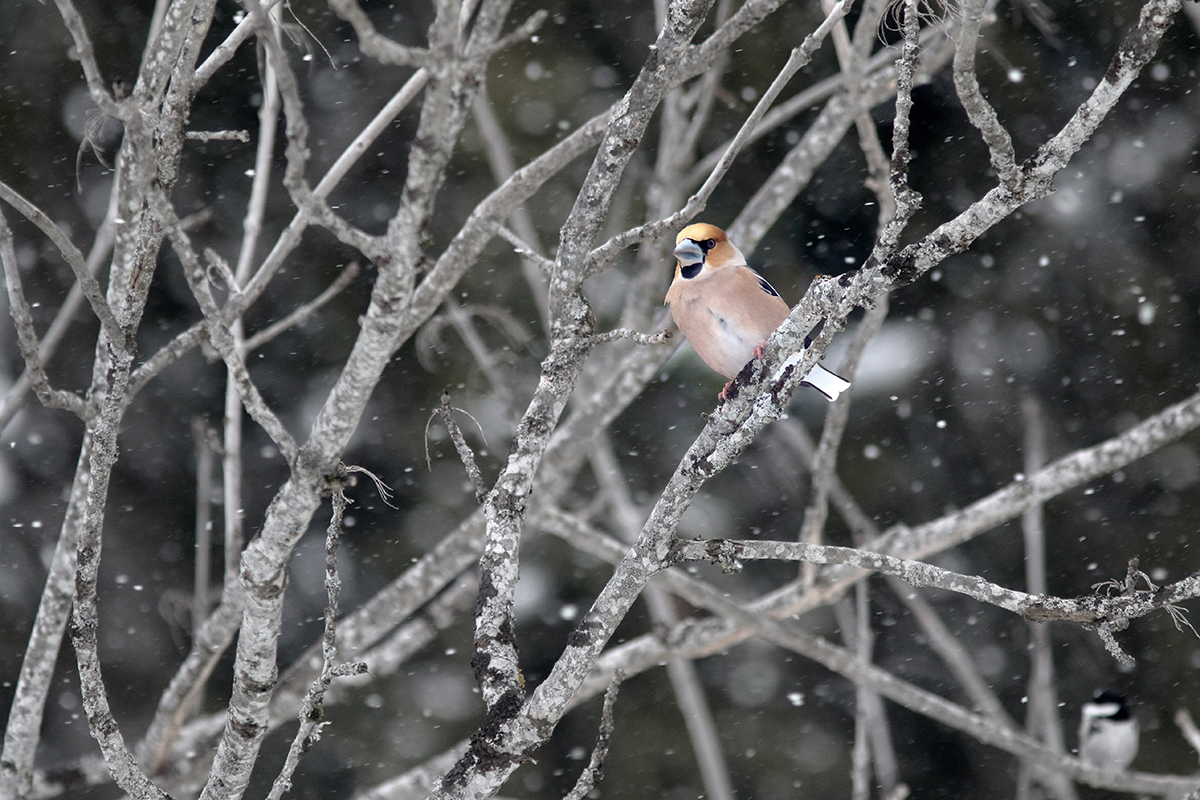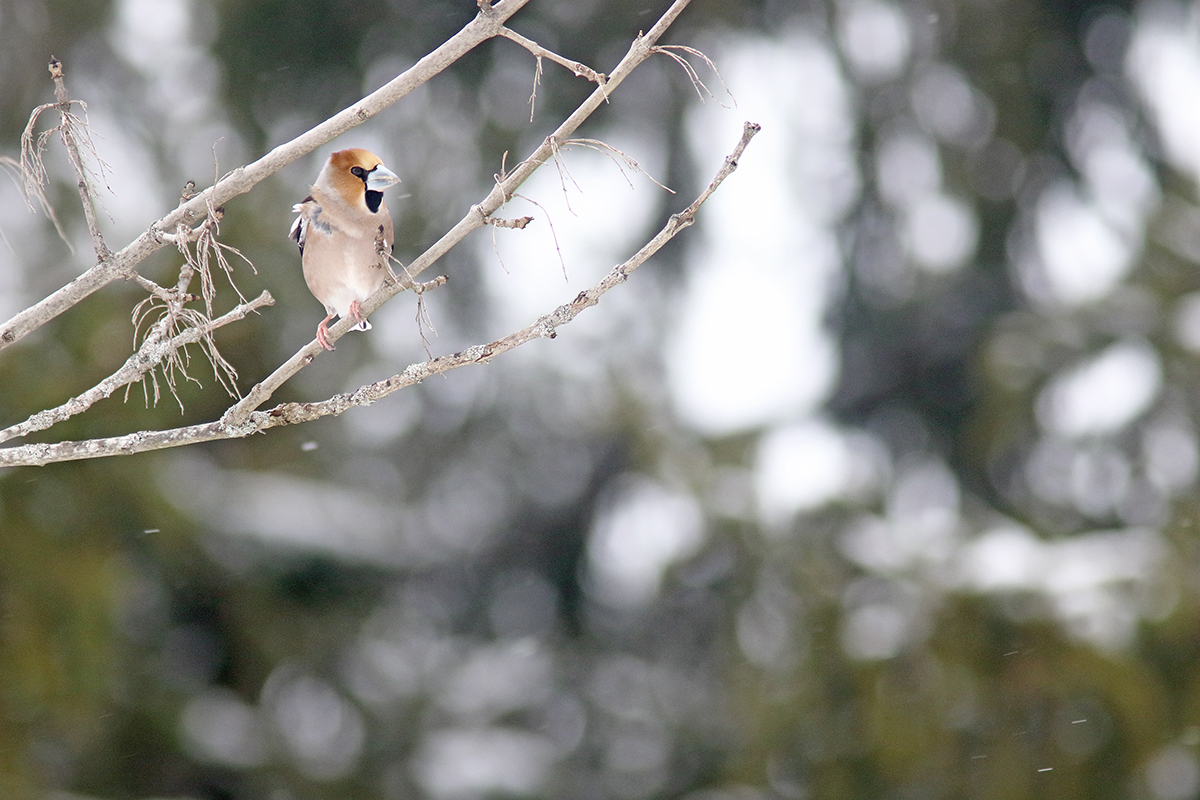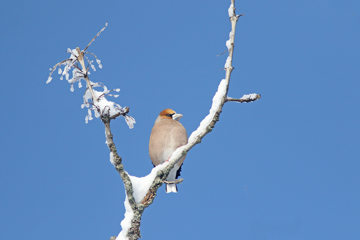 Dès que le soleil réapparait, la neige s’éclaircit et les oiseaux séduisent la lumière. Du haut de son arbre, un bouvreuil chante les prémices de l’amour.