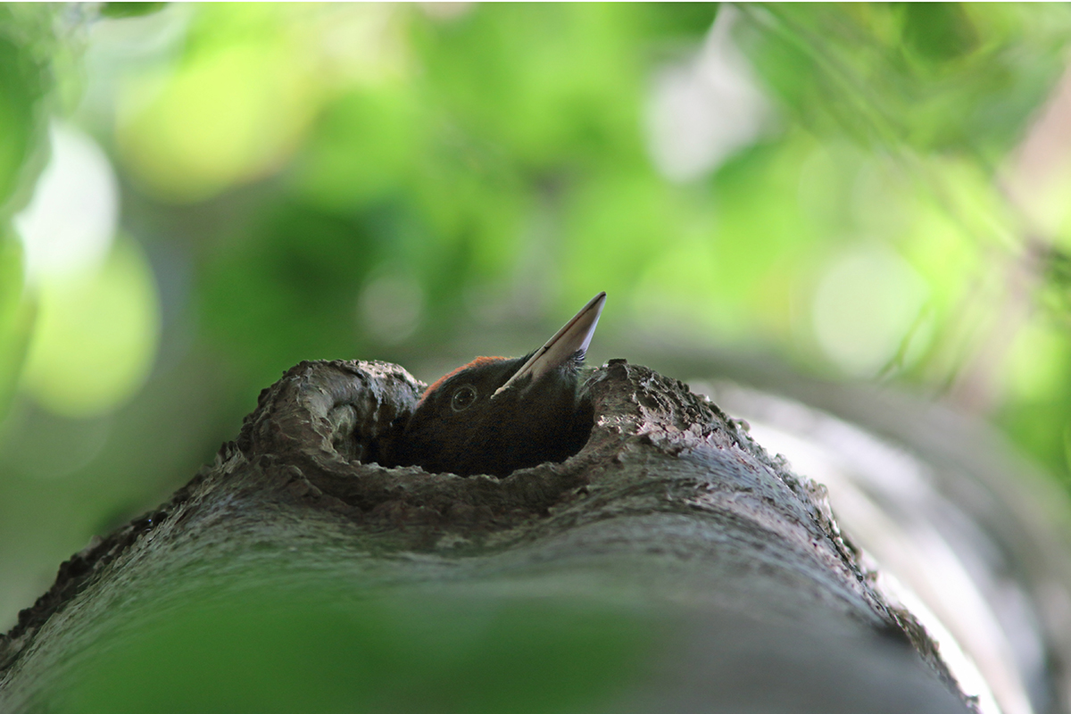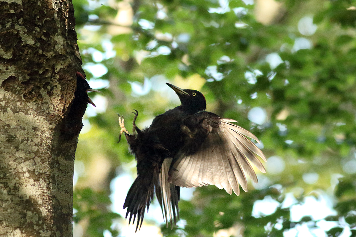 De jour en jour, les allers et retours se succèdent avec discrétion dans la grande forêt de hêtres, d’érables et d’épicéas. C’est début mai que j’entends pour la première fois les jeunes jaqueter à l’intérieur de la loge. Ils sont encore petits et restent bien à l’abri au fond de leur cavité.