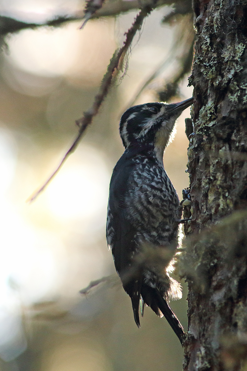 C’est aussi l’heure à laquelle le pic tridactyle s’affaire à arpenter son territoire à la recherche de vers à bois et de quelques gouttes de sève fraiche.