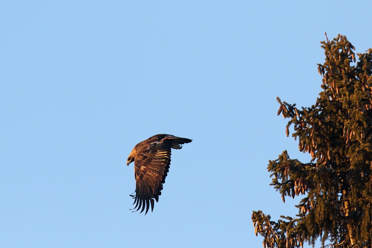 Je passe du coq à l’âne en vous présentant quelques images des aigles royaux jurassiens que j’ai passé beaucoup de temps à attendre, assis dans ma tente de camouflage, des heures et des heures durant.