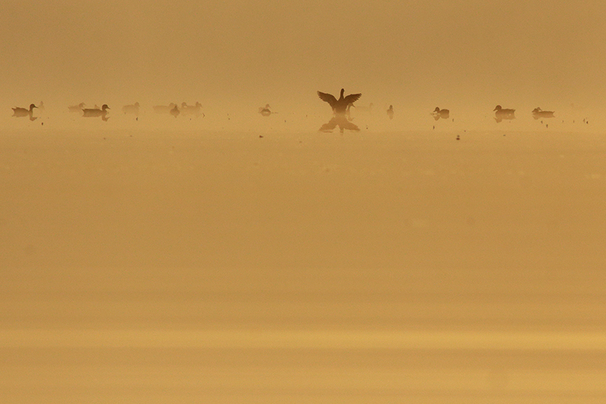 A une bonne heure de route des forêts su Haut-Jura, npous voilà dans le Bresse Jurassienne. La nuit était à la belle étoile, le ciel est clair, le soleil ne s’est pas encore levé. Je mets mon affût flottant à l’eau, me glisse à l’intérieur et m’éloigne du bord de l’étang. Mais j’ai beau m’éloigner, je dois me rendre à l’évidence : l’étang est quasiment à sec ! A peine 25 cm d’eau pour avancer. Impossible de rester debout, je dois avancer à plat ventre dans la vase et tenter de faire le moins de remous possibles.