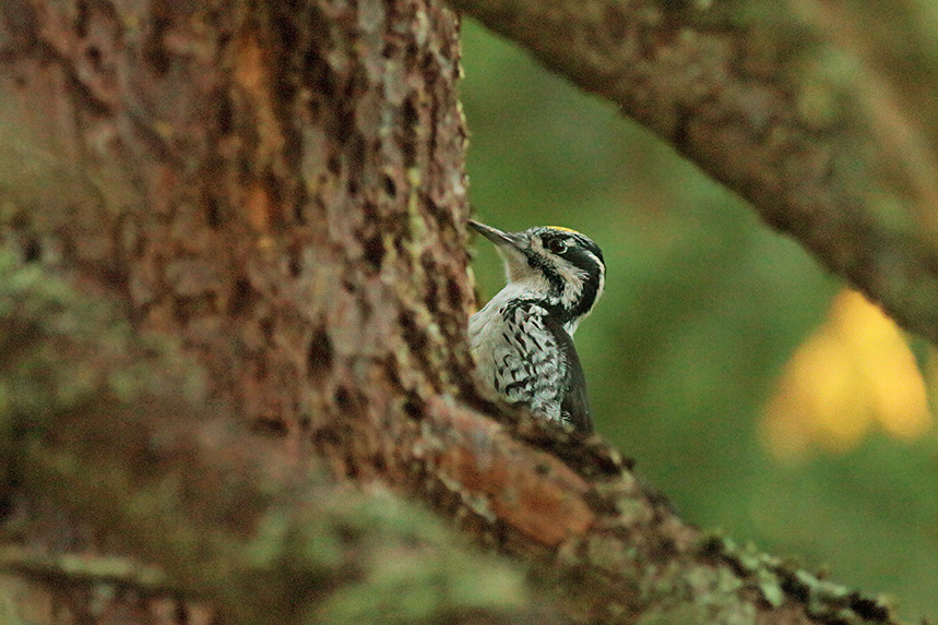 J’entends un pic tambouriner à une cinquantaine de mètres. Je ne le vois pas, c’est sans doute un pic épeiche qui martelle les épicéas à la recherche de vers à bois. Rien d’étonnant dans cette forêt qui regorge de bois de mort. Mais quand je le vois passer au vol entre deux arbres, je n’apperçois pas le rouge caractéristique de son croupion... Je l’entends à nouveau, cette fois un peu plus près. J’approche, appareil en main, silencieusement sr un tappis de myrtilles. Puis je le vois. Il est là, devant moi, à décortiquer l’écorce d’un épicéa déjà bien malade. Ce n’est pas un pic épeiche, mais un pic tridactyle !